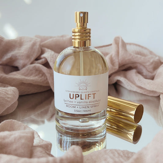Uplift Crystal Infused Room + Linen Spray | Lychee + Vanilla Absolute - Strawberry Quartz Crystals